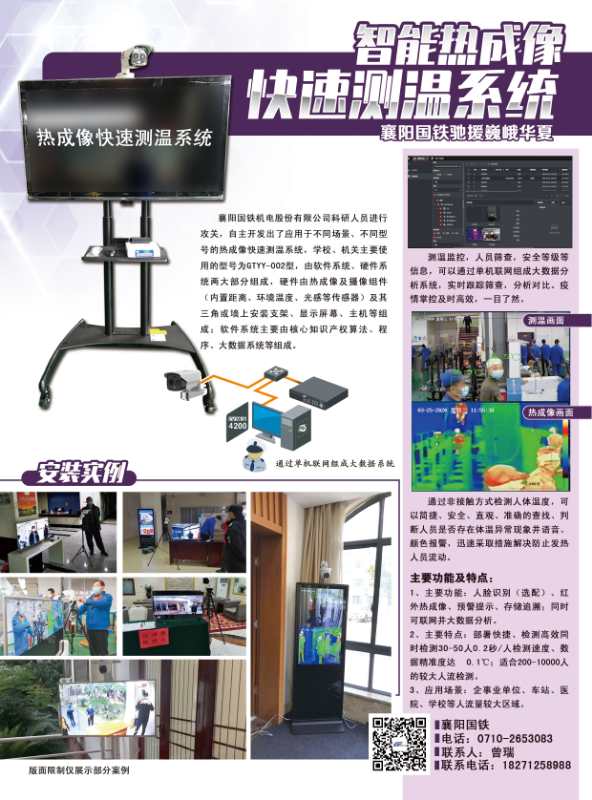 为解决防治新冠肺炎疫情中对大规模人群进行快速体温检测的需求,我会副会长单位襄阳国铁机电股份有限公司利用在测温、高端检测及大数据分析方面的经验及技术积累,组织研发团队远程办公,仅用7天就开发出可用于多领域的红外热成像快速测温系统,驰援战"疫"。该系统集快速大流量检测、人群体温异常筛查、疫情大数据分析、人脸识别、实名制与体温对比及考勤管理解决方案为一体,通过热成像快速扫描,同时对30-50人进行体温快速检测、筛查、报警和隔离。人员通行、分析及隔离效率可达0.5秒每人次。系统可同时作为视频录像使用,可存储、回放28天数据,通过记录对应人员的身份、考勤及体温的监控与大数据记录,可实现科学化、精准化、数据化的疫情分析,便于疫情精确分析以及常态化管理。与其他测温设备比较,该系统可有效解决人工测温效率低、近距离接触测温风险高等问题。