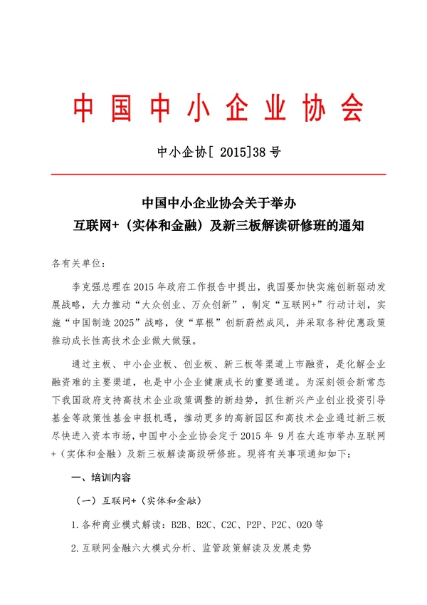 转发:中国中小企业协会关于举办互联网加及新三板解析研修班的通