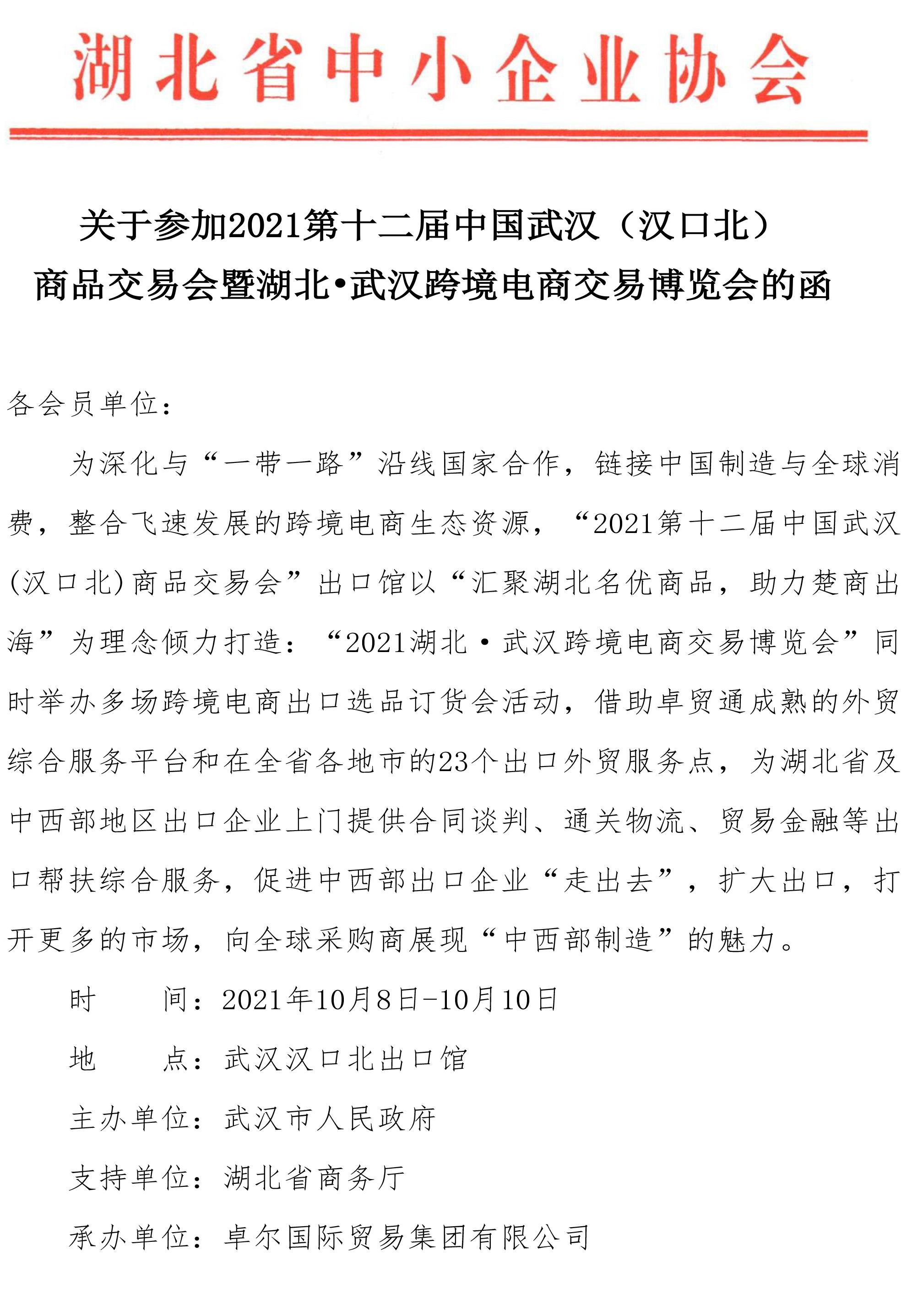 关于参加2021第十二届中国武汉(汉口北) 商品交易会的函