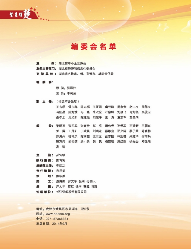 画册的编辑工作中,得到了协会会员单位的积极响应,得到了省经信委和各市州有关部门及有关单位的大力支持。在此,我们谨向他们表示衷心的感谢!由于时间紧迫,画册在内容方面,难免挂一漏万;在形式方面,也未能尽善尽美。在此,我们谨向读者以及那些未能入选的优秀中小企业表示诚挚的歉意。