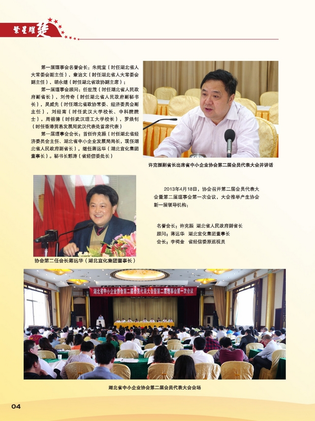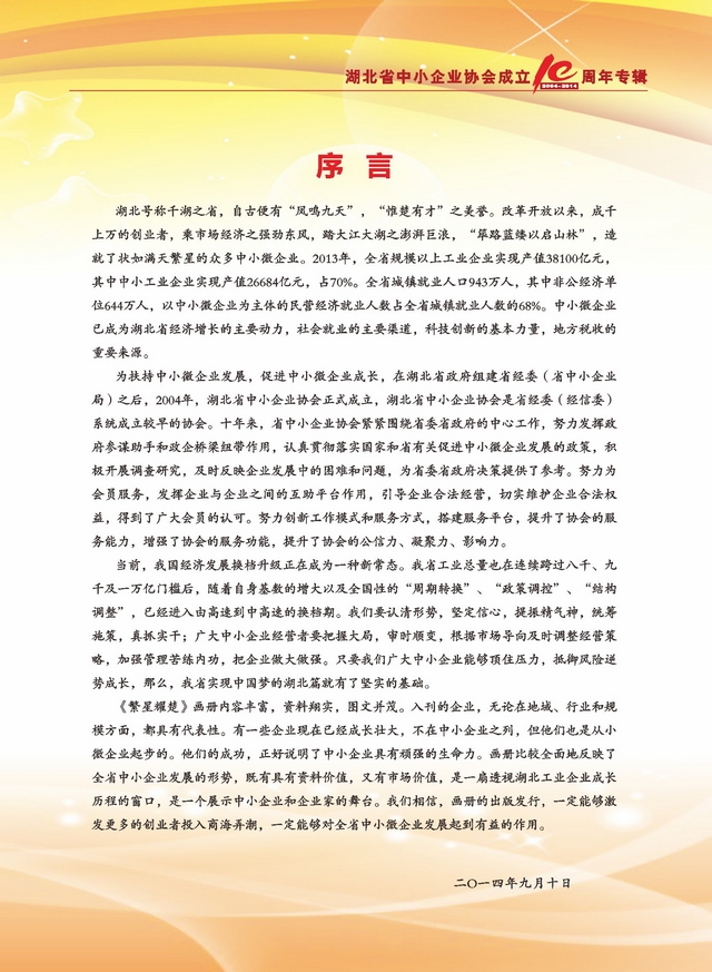 《繁星耀楚》画册内容丰富,资料翔实,图文并茂。入刊的企业,无论在地域、行业和规模方面,都具有代表性。有一些企业现在已经成长壮大,不在中小企业之列,但他们也是从小微企业起步的。他们的成功,正好说明了中小企业具有顽强的生命力。画册比较全面地反映了全省中小企业发展的形势,既有具有资料价值,又有市场价值,是一扇透视湖北工业企业成长历程的窗口,是一个展示中小企业和企业家的舞台。我们相信,画册的出版发行,一定能够激发更多的创业者投入商海弄潮,一定能够对全省中小微企业发展起到有益的作用。