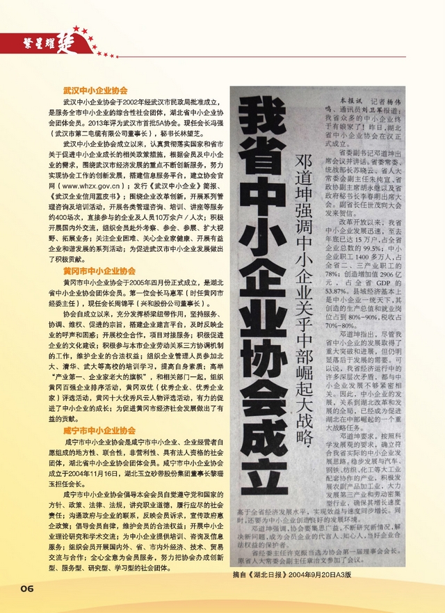 十年前的今天, 湖北省中小企业协会在武汉宣告成立。2003年12月,省政府实施机构改革,决定成立省经委(省中小企业发展局),赋予负责全省经济运行、中小企业、民营企业、乡镇企业及县域经济发展的工作职能。为适应省经委工作职能的需要,决定成立省中小企业协会。经过一段时间筹备,2004年9月19日,湖北省中小企业协会在汉正式成立。大会通过了《湖北省中小企业协会章程》,推举出朱纯宣(时任湖北省人大常委会副主任)等三名名誉会长;任世茂(时任湖北省人民政府副省长)等六名顾问。选举许克振(时任湖北省经济委员会主任、湖北省中小企业发展局局长,现任湖北省人民政府副省长)为会长,丁志坚(时任黄冈市窑中瓷窑炉有限责任公司董事长兼总经理)等65人为副会长,郭涛(时任省经委处长)为秘书长。2007年,在协会第一届理事会第二次会议上,许克振因去咸宁任职,辞去会长职务,蒋远华(湖北宜化集团董事长)被选举为会长。