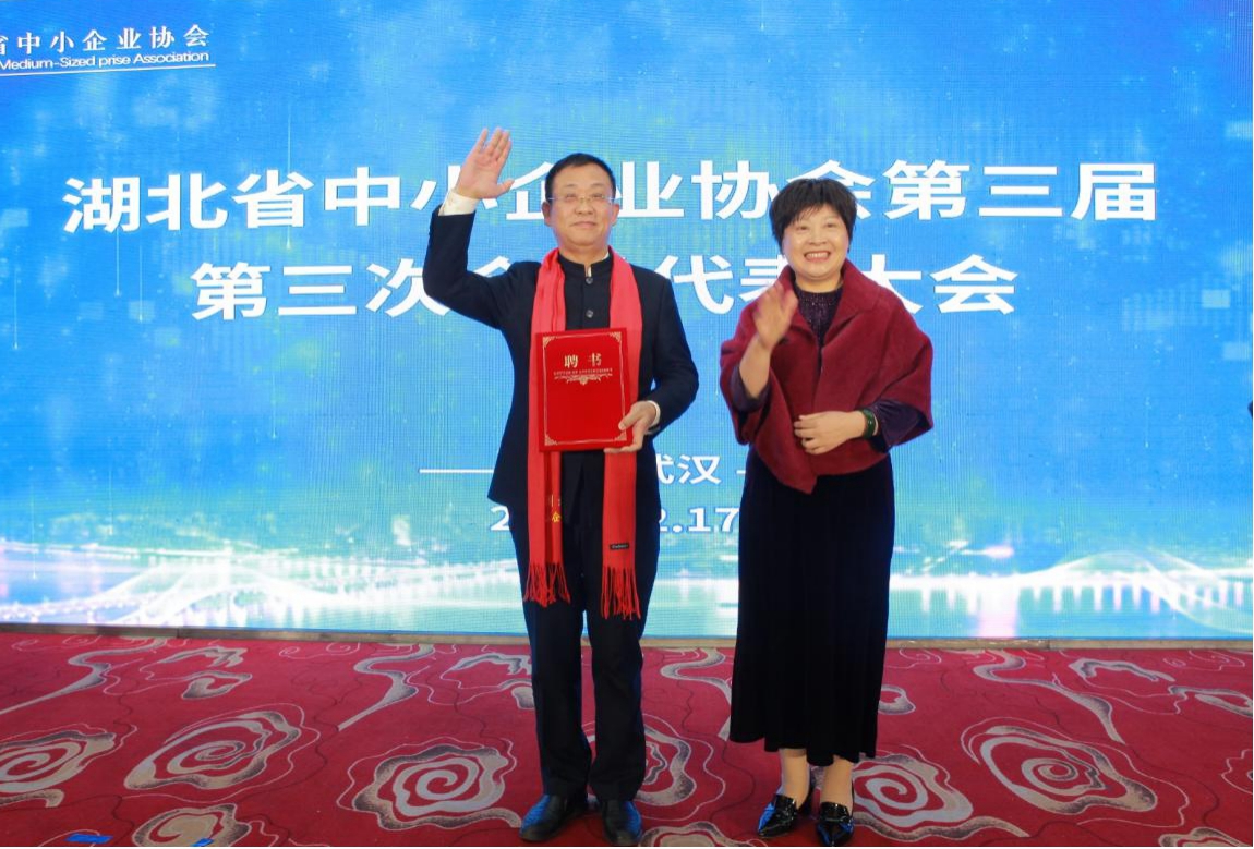 图:新任湖北省中小企业协会会长谢清伦为秘书长雷焕松颁发聘书