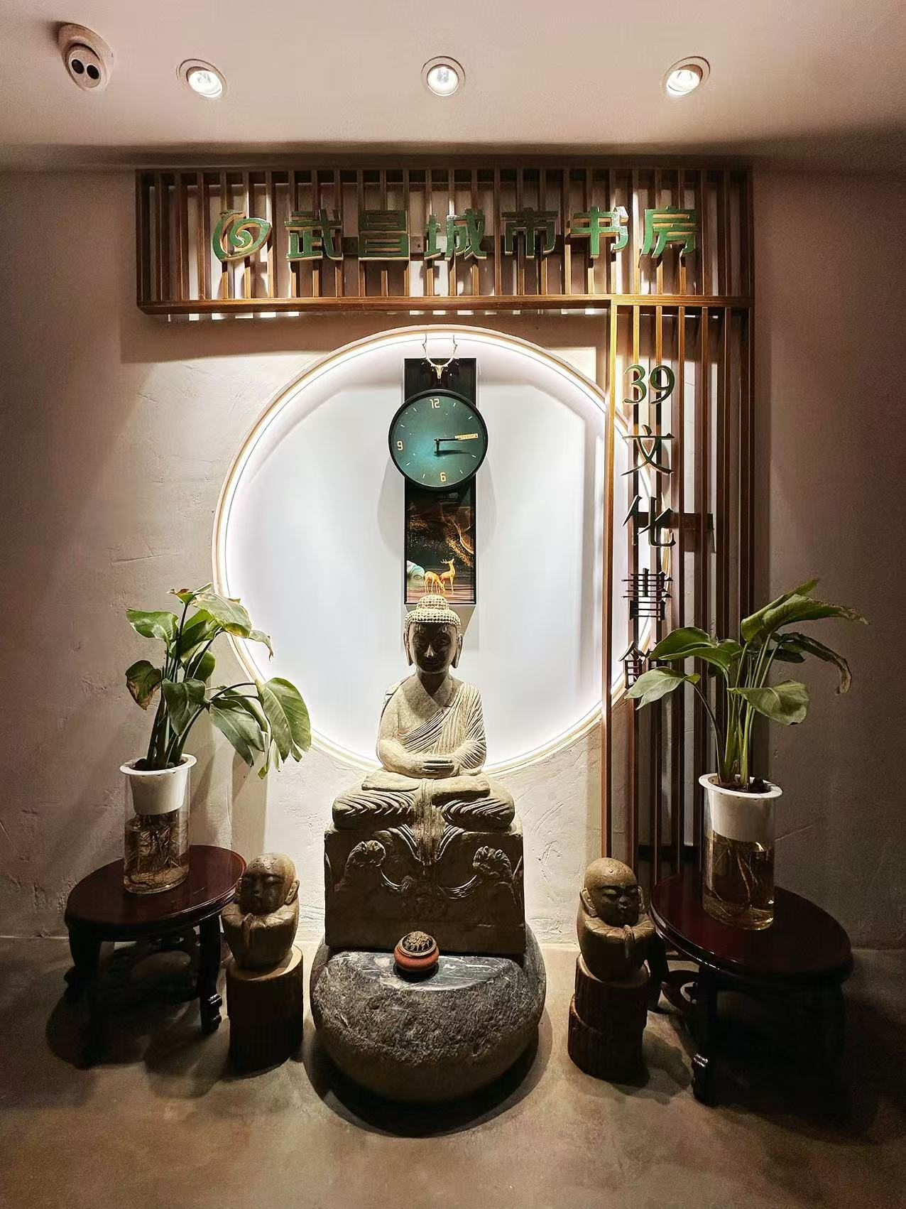 位于武昌区中北路德成中心裙楼顶层,在繁华的CBD商业街区内开辟出闹中取静的阅读空间。这是一个开在都市里的文化书房,是武昌区第二家开放的城市书房。这是一个明清风格显著的空间,文化味浓郁,装饰古朴典雅,上下两层结构,总面积约1856平方米。茶香与书香在此交融浸润,滋养出古色古香的韵味。鹅卵石、青砖块、白沙粒,铺就的庭院小径上各种绿植盎然生长,这里既是茶室,也是书房,随处可见的古画、石器、旧物件、水草花卉,在这里构成了一幅纯美的绝世画卷。全场能同时容纳百余人,适合开展各类活动,大荧幕、电视屏、音响、小舞台、音乐吧,及可容纳20人的特色餐饮等配备齐全。